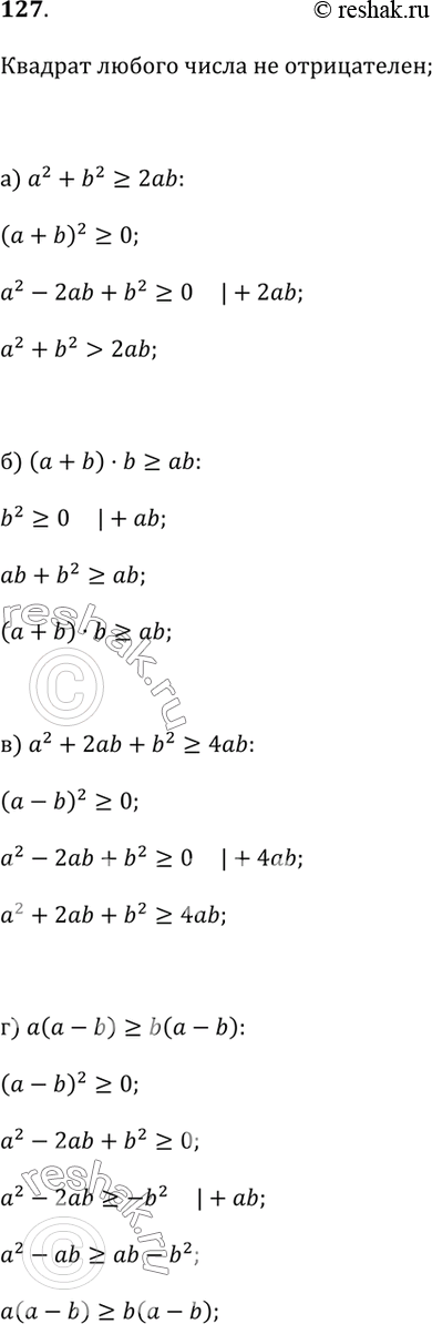 127. Докажите, что для любых чисел а и b: а) a^2 + b^2 ? 2ab; б) (a + b) · b ?