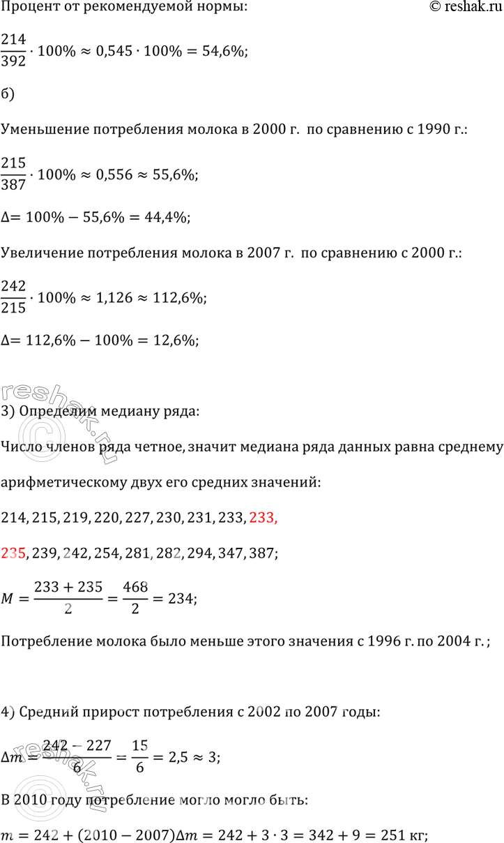 3) Определите медиану представленного ряда данных. Проведите на диаграмме линию, соответствующую этому значению. В какие годы потребление молока было меньше этого среднего значения?