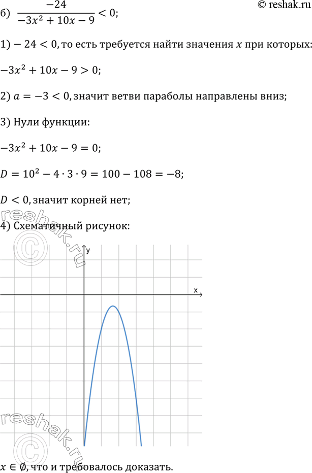 б) Докажите, что выражение -24 / (-3x^2 + 10x - 9) НИ при каких значениях х не принимает отрицательные значения.