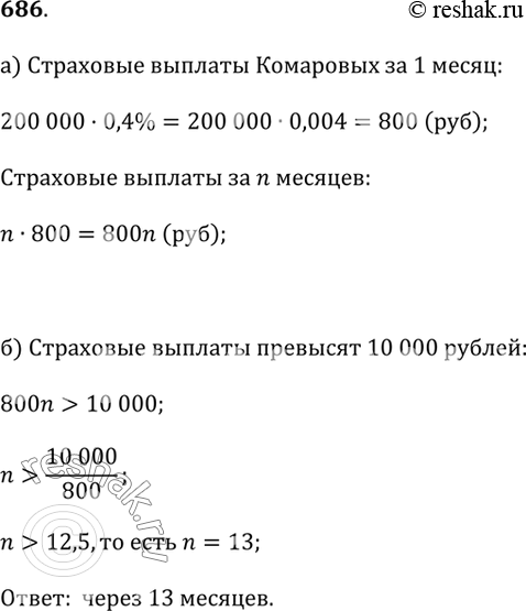 686. Семья Комаровых взяла в банке потребительский кредит 200 тыс. р. на 24 месяца и оформила страховку от несчастных случаев и болезней заёмщика, стоимость которой составляет 0,4% от первоначальной суммы кредита ежемесячно.