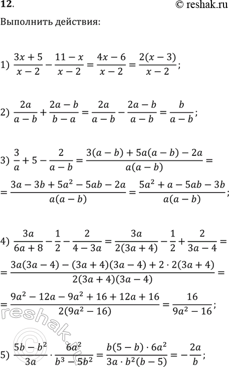 Выполнить действия: 1) (3x+5)/(x-2) - (11-x)/(x-2); 2) 2a/(a-b) + (2a-b)/(b-a); 3) 3/a + 5 - 2/(a-b); 4) 3a/(6a+8) -1/2 - 2/(4-3a);