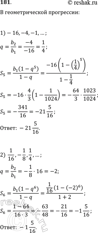 181. Найти сумму n первых членов геометрической прогрессии: 1) -16, -4, -1, ..., если n = 5; 2) 1/16, 1/8, 1/4, ..., если n = 6.
