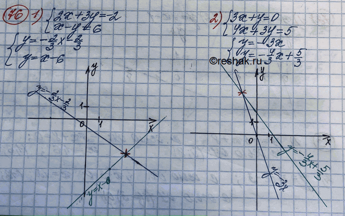 Решить графически систему уравнений: 1) система 2x+3y=-2, x-y=6; 2) система 3x+y=0, 4x+3y=5.