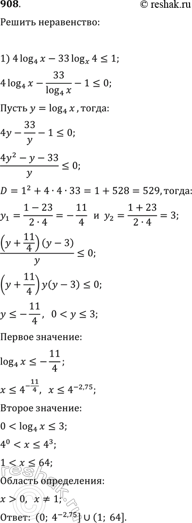Решить неравенство (908—910). 908. 1) 4*логарифм х по основанию 4-33*логарифм 4 по основанию х2) логарифм 3 по основанию x3) логарифм