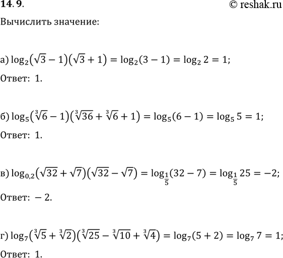 14.9 а) log 2 ((корень 3 - 1)(корень 3+1));б)log 5 ((корень 3 степени 6 - 1)(корень 3 степени 36 + корень 3 степени 6 +1));в)log 0,2 ((корень 32 - корень 6)(корень 32 - корень 7));г)log 7 ((корень 3 степени 5 + корень 3 степени 2)(корень 3 степени 25 - корень 3 степени 10 + корень 3 степени 4)).