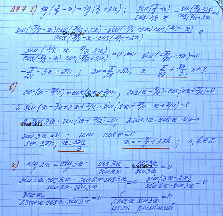 27.7 а)sin(3x+Пи/3)=sin(x-Пи/6);б)tg(Пи/8-x)=tg(Пи/6 + 2x);в)cos(x-Пи/4)=cos(2x+Пи/4);г)ctg2x=ctg3x.