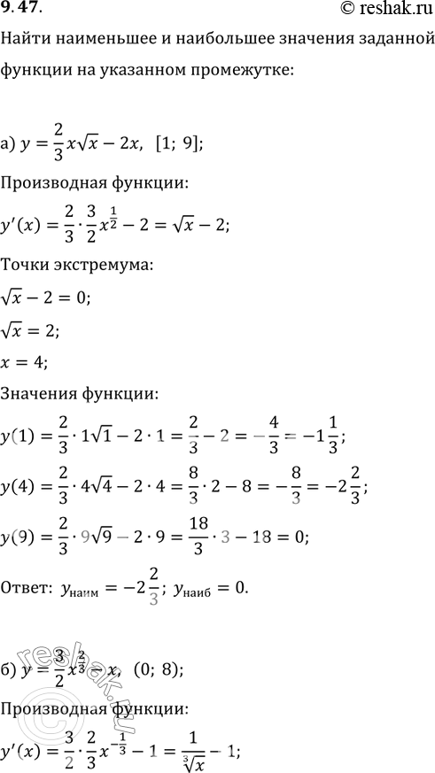 9.47. Найдите наименьшее и наибольшее значения заданной функции на заданном промежутке:а) у = 2/3х корень х - 2х, [1; 9];в) у = 2/3х корень х - 2х, (1;
