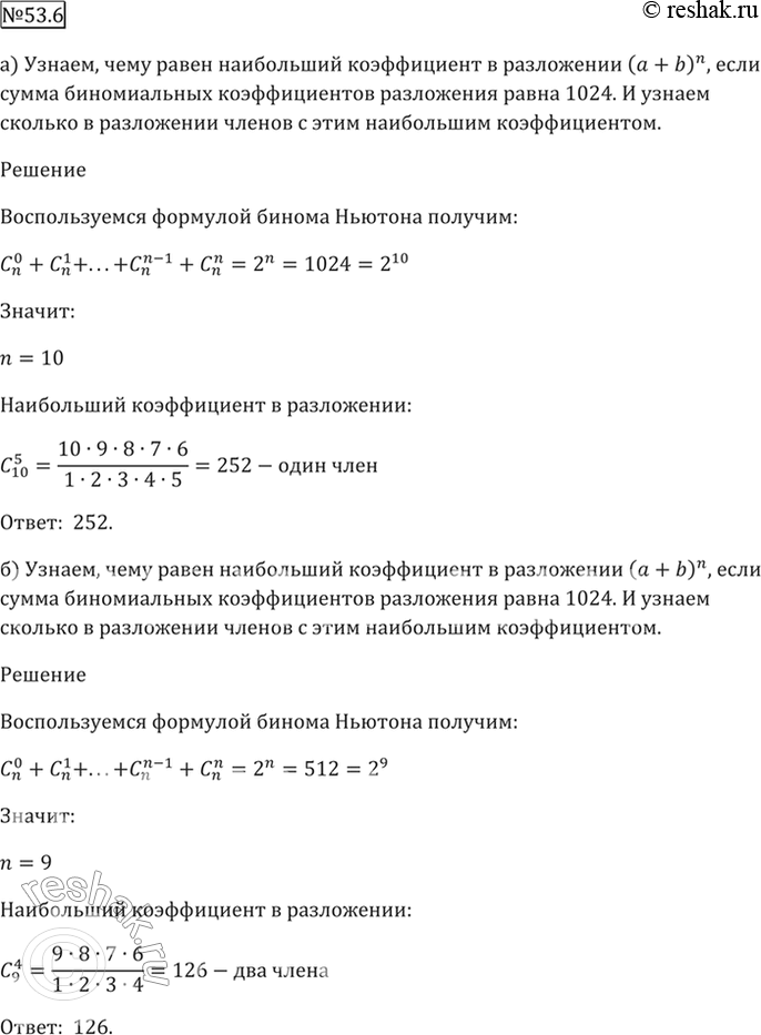 53.6 Чему равен наибольший коэффициент в разложении (а + Ь)^n, если сумма биномиальных коэффициентов разложения равна: а) 1024; б) 512? Сколько в разложении членов с этим наибольшим коэффициентом?