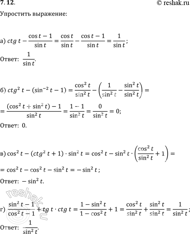7.12 Упростите выражение: a) ctg t - (cos t - 1) / sin t; 6) ctg^2(t) - (sin^(-2)(t) - 1); в) cos^2(t) - (ctg^2(t) + 1) * sin^2(t);