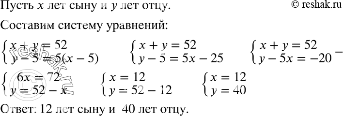 1087 Отцу и сыну вместе 52 года. Пять лет тому назад отец был в 5 раз старше сына. Сколько лет каждому?