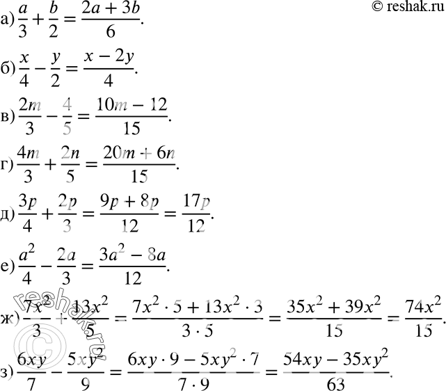 Преобразуйте в алгебраическую дробь (513—528): 513 а) a/3+b/2; б) x/4-y/2; в) 2m/3-4/5; г) 4m/3+2n/5; д) 3p/4+2p/3; е) a2/4-2a/3; ж) 7x2/3+13x2/5; з) 5xy/7-5xy2/9.