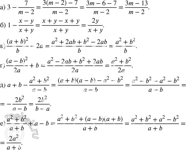 522 а) 3-7/(m-2); б) 1-(x-y)/(x+y); в) (a+b)2/b-2a; г) (a-b)2/2a+b; д) a+b-(a2+b2)/(a-b); е) (a2+b2)/(a+b)+a-b.