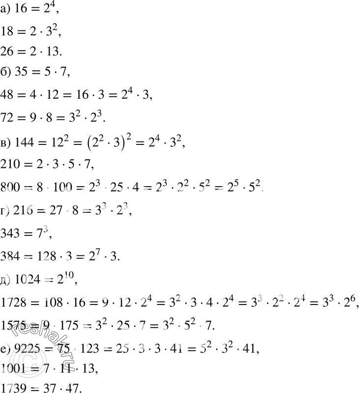 55. Разложите на простые множители числа, т. е. запишите число в виде произведения степеней простых чисел: а) 16, 18, 26; б) 35, 48, 72;