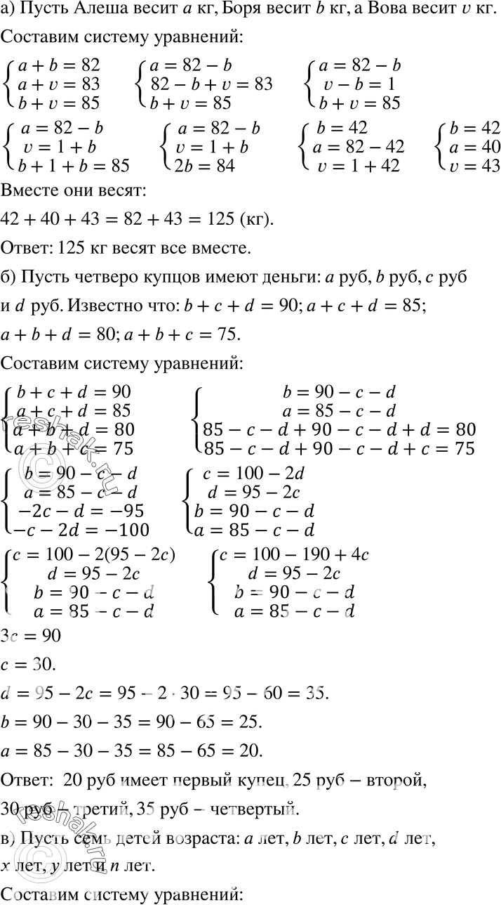 б) Старинная задача. Четверо купцов имеют некоторую сумму денег. Известно, что, сложившись без первого, они соберут 90 р.; сложившись без второго — 85 р.; сложившись без третьего — 80 р.; сложившись без четвёртого — 75 р. Сколько у кого денег?