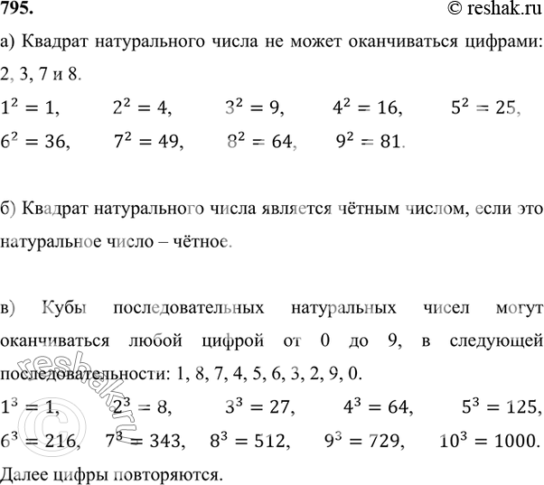 795 а) Какой цифрой не может оканчиваться квадрат натурального числа? б) В каких случаях квадрат натурального числа является чётным числом? в) Какими цифрами оканчиваются кубы последовательных натуральных чисел?