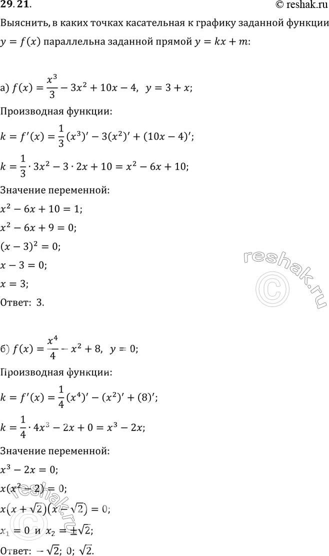29.21 В каких точках касательная к графику заданной функции у = f(x) параллельна заданной прямой у = kx + m: а) f(x) = x^3 / 3 - Зx^2 + 10x - 4, у = 3 + х;