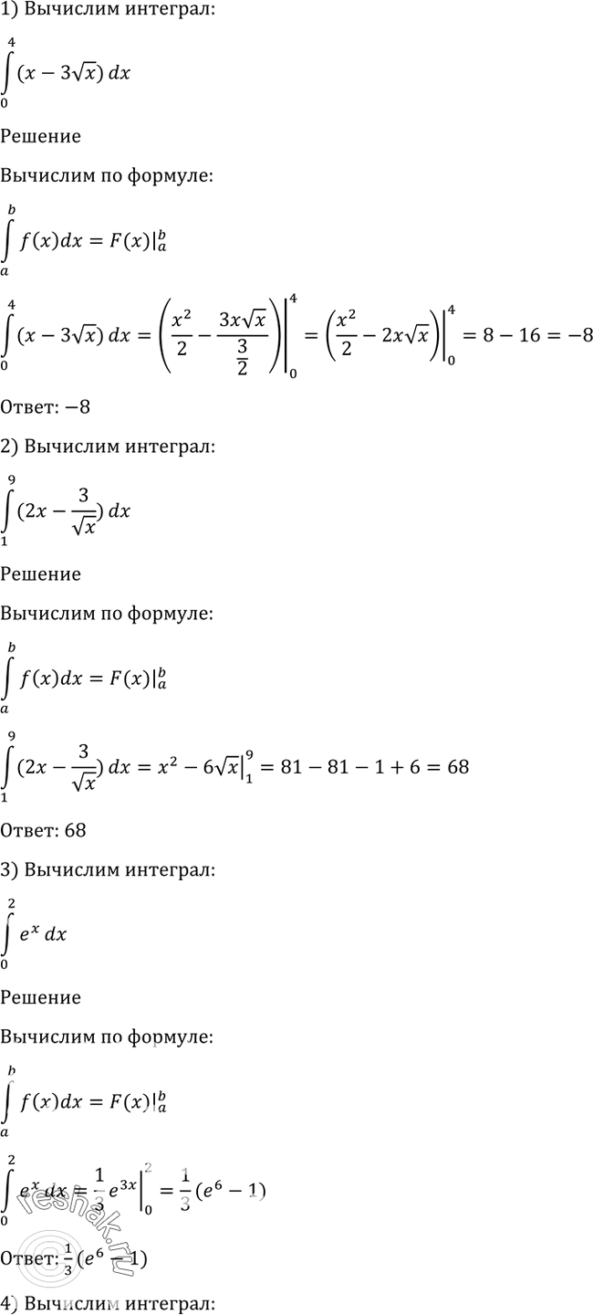 Решение задачи: 1007 1) интеграл (0;4) (x-3корень x)dx; 2) интеграл (1;9) (2x-3/корень x)dx; 3) интеграл (0;2) e3xdx; 4) интеграл (1;3) 2e2xdx.Решение задачи: 1007 1) интеграл (0;4) (x-3корень x)dx; 2) интеграл (1;9) (2x-3/корень x)dx; 3) интеграл (0;2) e3xdx; 4) интеграл (1;3) 2e2xdx.Решение задачи: 1007 1) интеграл (0;4) (x-3корень x)dx; 2) интеграл (1;9) (2x-3/корень x)dx; 3) интеграл (0;2) e3xdx; 4) интеграл (1;3) 2e2xdx.