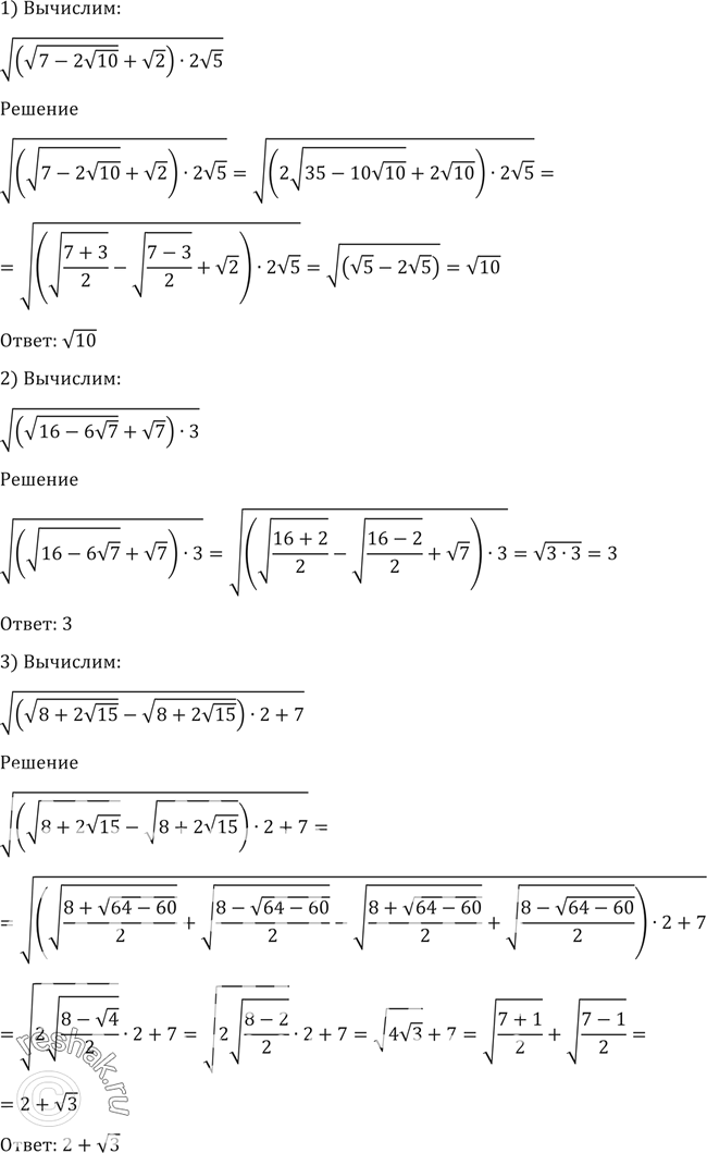 12. Вычислить 1) корень (корень(7-2 корень 10) + корень 5) 2) корень (корень(16-6 корень 7) + корень 7)*3 3) корень