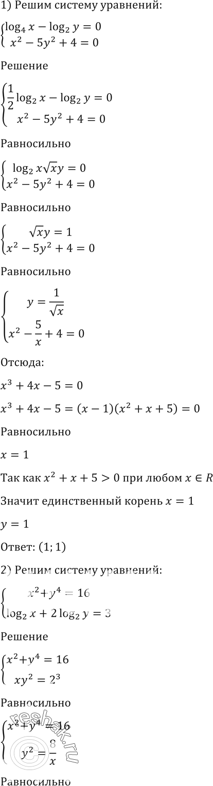 1427 1) система log4(x)-log2(y)=0, x2-5y2+4=0; 2) система x2+y4=16, log2(x) + 2log2(y) =3.