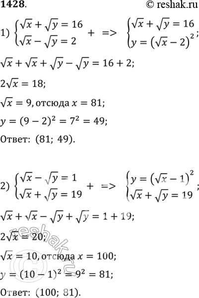 1428 1) система корень x + корень y =16, корень x- корень y=2; 2) система корень x- корень y=1, корень x+корень y=19.