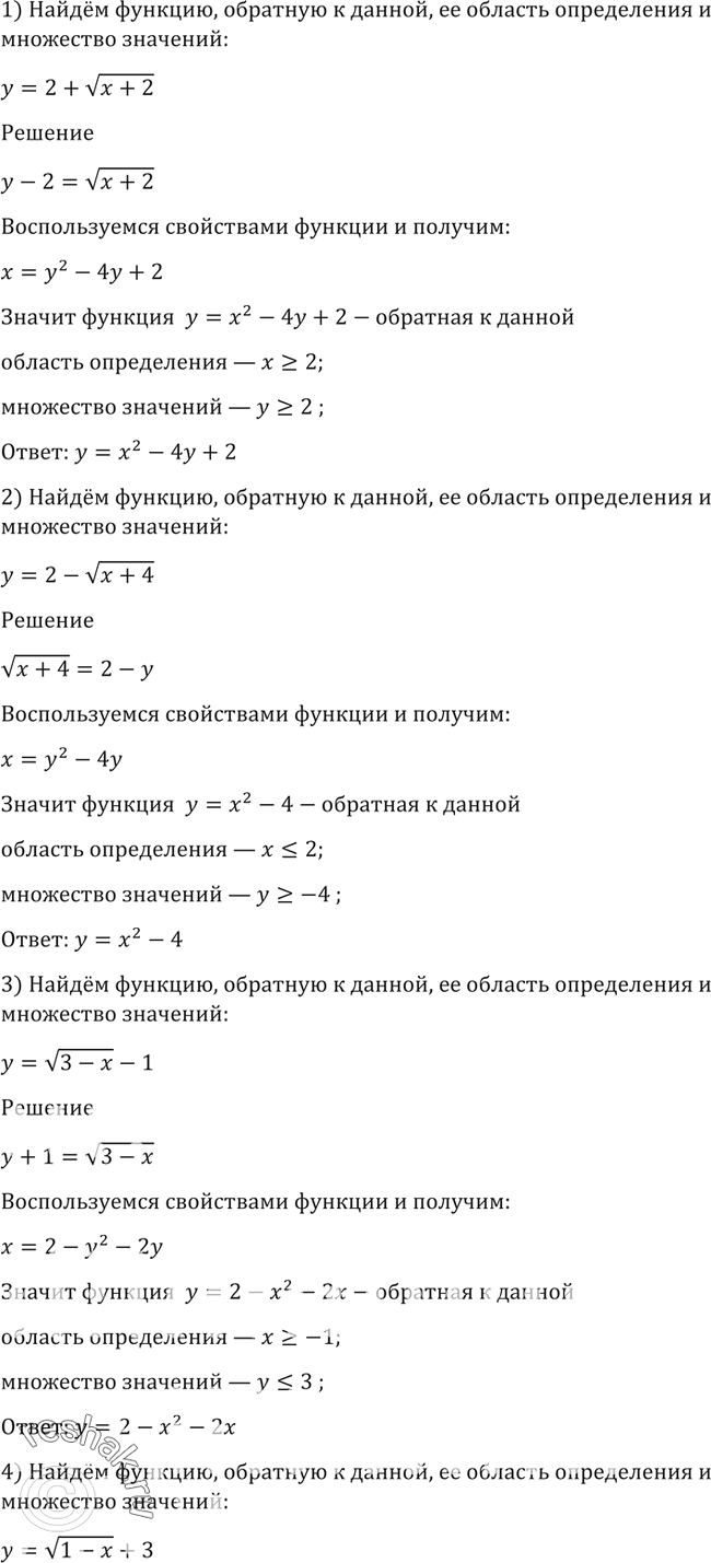 186. Найти функцию, обратную к данной, её область определения и множество значений: 1) y=2+ корень (x+2); 2) y=2+ корень (x+4); 3) y=корень (3-x) - 1;
