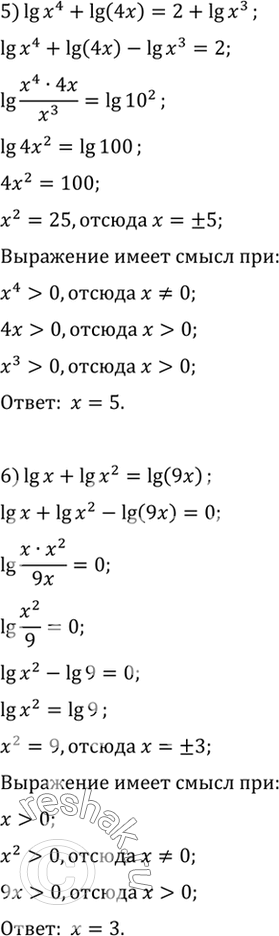 5) lg x4 + lg (4x) = 2 + lg x3;