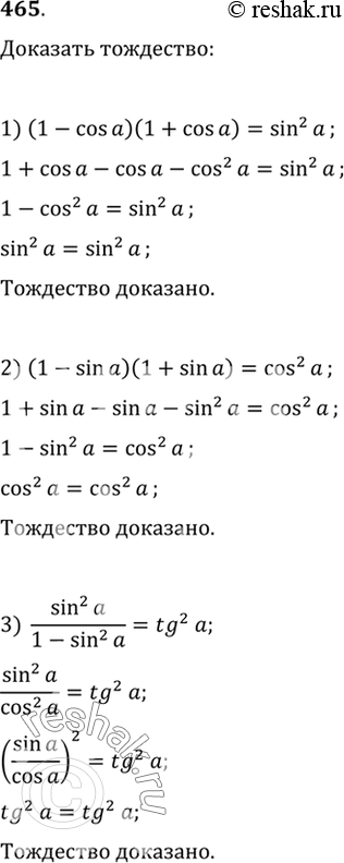 465 Доказать тождество: 1) (1-cosa)(1+cosa) = sin2a; 2) (1-sina)(1+sina) = cos2a; 3) sin2a/(1-sin2a) = tg2a; 4) cos2a/(1-cos2a) = ctg2a; 5) 1/(1+tg2a) + sin2a =1;