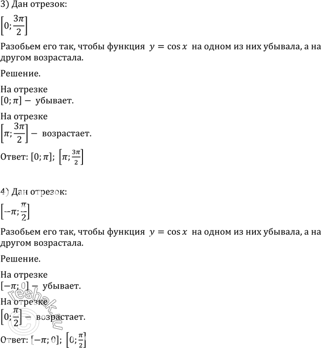 710 Разбить данный отрезок на два отрезка так, чтобы на одном из них функция у = cos х возрастала, а на другом убывала: