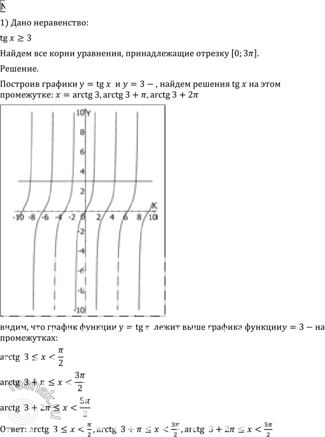 741 Найти все решения неравенства, принадлежащие отрезку [0; 3пи]: 1) tg х >= 3; 2) tg х 3) tg х 4) tg х >