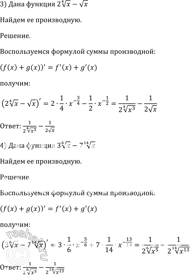 805 Найти производную функции: 1) x2+1/x3; 2) x3+1/x2; 3) 2 корень 4 степени x - корень x; 4) 3 корень 6 степени x + 7 корень 14 степени x.