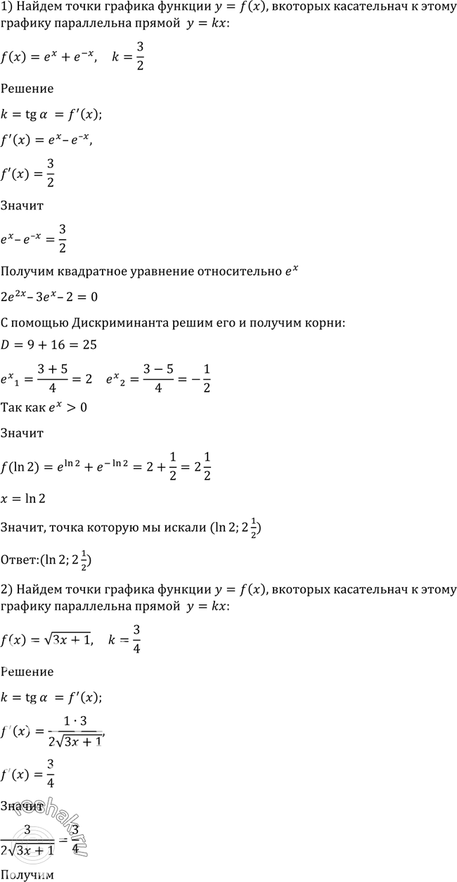 866 Найти точки графика функции у = f (х), в которых касательная к этому графику параллельна прямой у = kx: 1) f(x)=ex + e^-x, k=3/2;