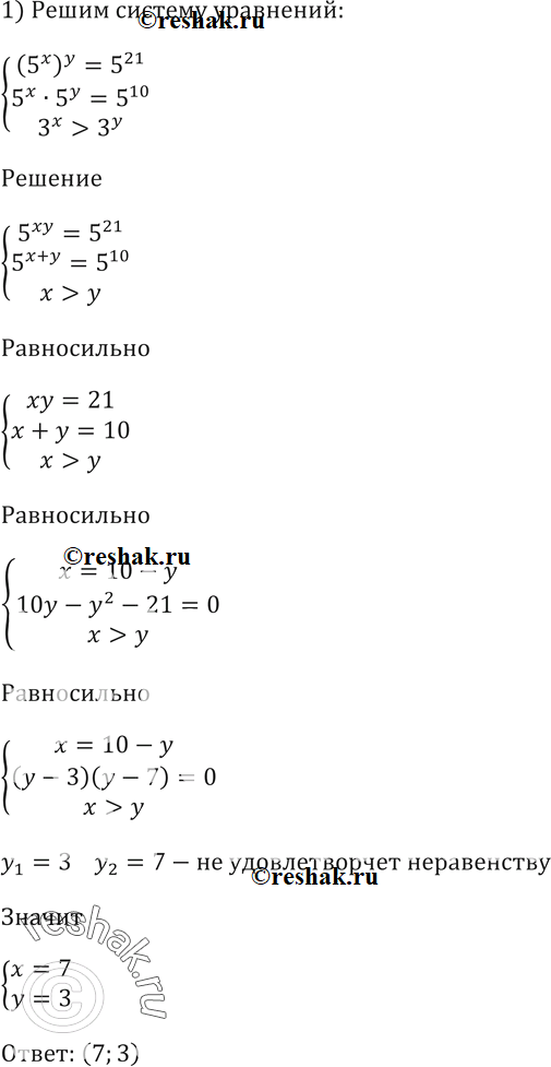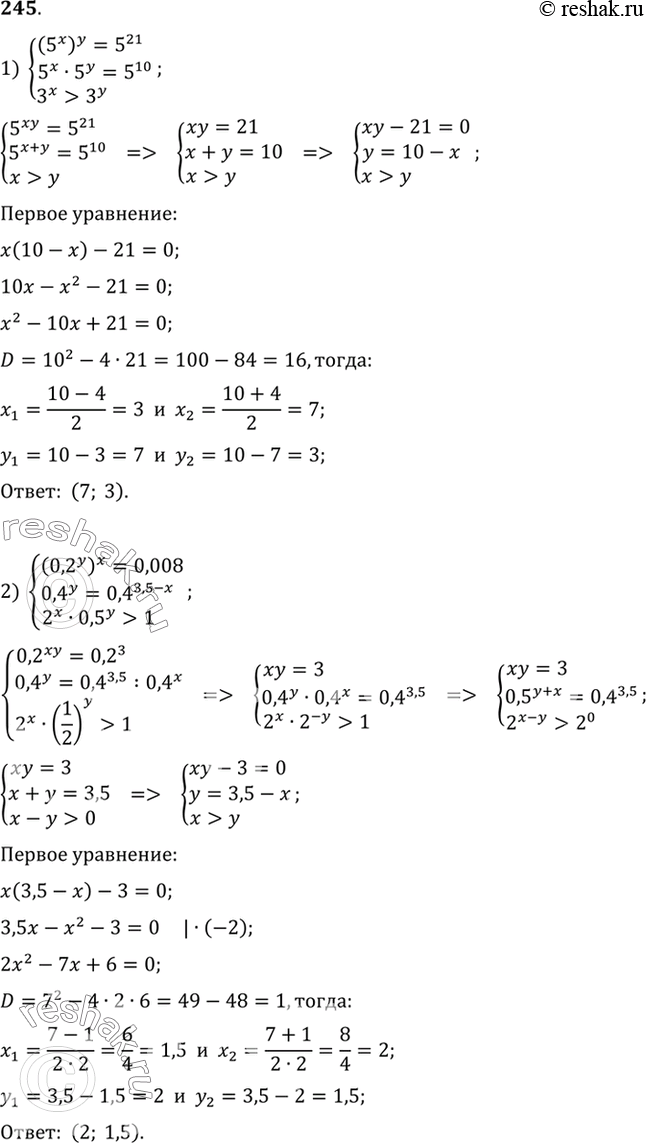 245. 1)система (5x)y =5^21, 5x*5y=5^10, 3x>3y; 2) система (0,2y)x=0,008, 0,4y=0,4^(3,5-x), 2x*0,5y>1.