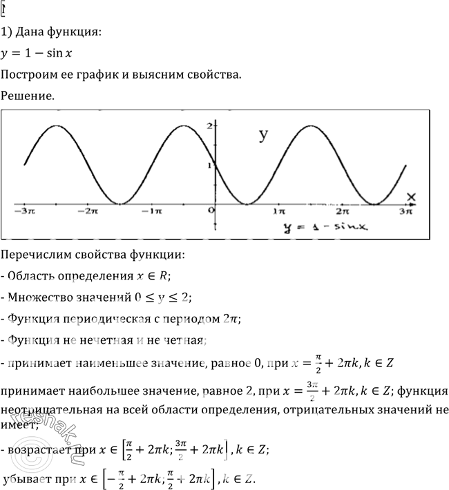729 Построить график функции и выяснить её свойства: 1) у = 1 - sin х; 2) у = 2 + sin х;
