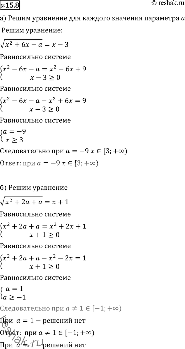 15.8 а) корень (x2-6x-a) = x-3; б) корень (x2+2x+a) = x+1.