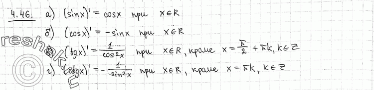 4.46 Запишите формулу для нахождения производной функции: а) у = sinx; б) у = cosx; в) y = tgx; г) y = ctgx.