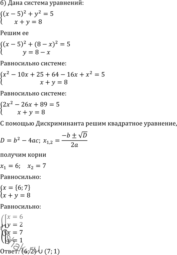 222 (МИРЭА) а) система (x-2)2+y2=10 x+y=6; б) система (x-5)2+y2=5 x+y=8; в) система (x-6)2+y2=10 x+y=10; г) система (x-5)2+y2=10 x+y=5.