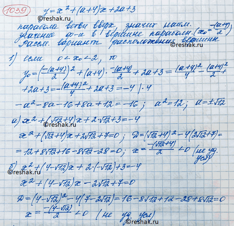 1038 Найти все значения а, при каждом из которых наименьшее значение функции у = х2 + (а + 4)х + 2а + 3 на отрезке [0;
