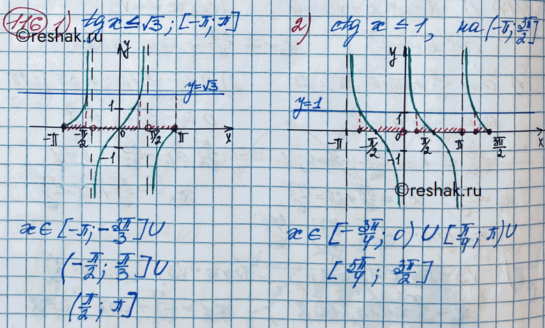 116. С помощью графиков функций y = tgx и y = ctgx найти все такие значения x из заданного промежутка, при которых справедливо неравенство: