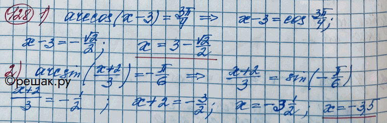 128. Решить уравнение: 1) arccos(x-3)= 3пи/4; 2) arcsin (x+2/3) = - пи/6.