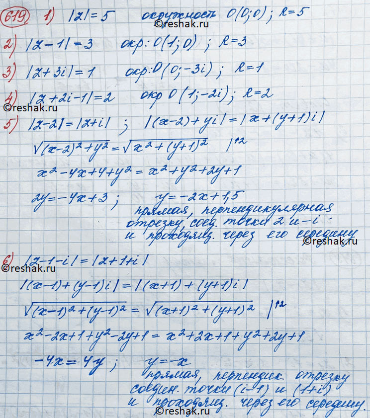 619. Найти множество точек комплексной плоскости, удовлетворяющих условию: 1) |z| = 5; 2) |z- 1| = 3; 3) |z + 3i| = 1;