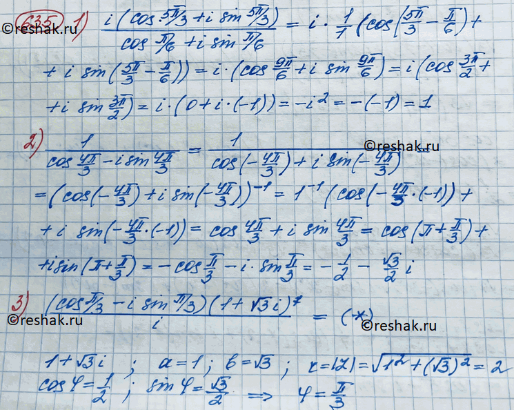 635. Выполнить действия и записать результат в алгебраической форме: 1) i(cos 5пи/3 + isin 5пи/3)/ cos пи/6 + isin пи/6; 2) 1/ cos 4пи/3 - isin 4пи/3;