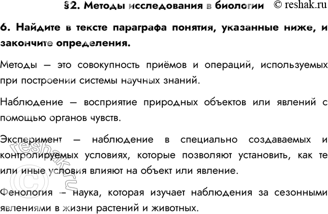 6. Найдите в тексте параграфа понятия, указанные ниже, и закончите определения. Методы – это совокупность приёмов и операций, используемых при построении системы научных знаний.