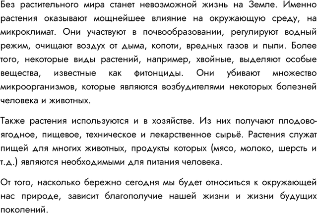 Без растительного мира станет невозможной жизнь на Земле. Именно растения оказывают мощнейшее влияние на окружающую среду, на микроклимат. Они участвуют в почвообразовании, регулируют водный режим, очищают воздух от дыма, копоти, вредных газов и пыли. Более того, некоторые виды растений, например, хвойные, выделяют особые вещества, известные как фитонциды. Они убивают множество микроорганизмов, которые являются возбудителями некоторых болезней человека и животных.
