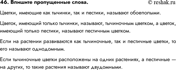 46. Впишите пропущенные слова. Цветки, имеющие как тычинки, так и пестики, называют обоеполыми. Цветок, имеющий только тычинки, называют, тычиночным цветком, а цветок, имеющий только пестики, называют пестичным цветком.