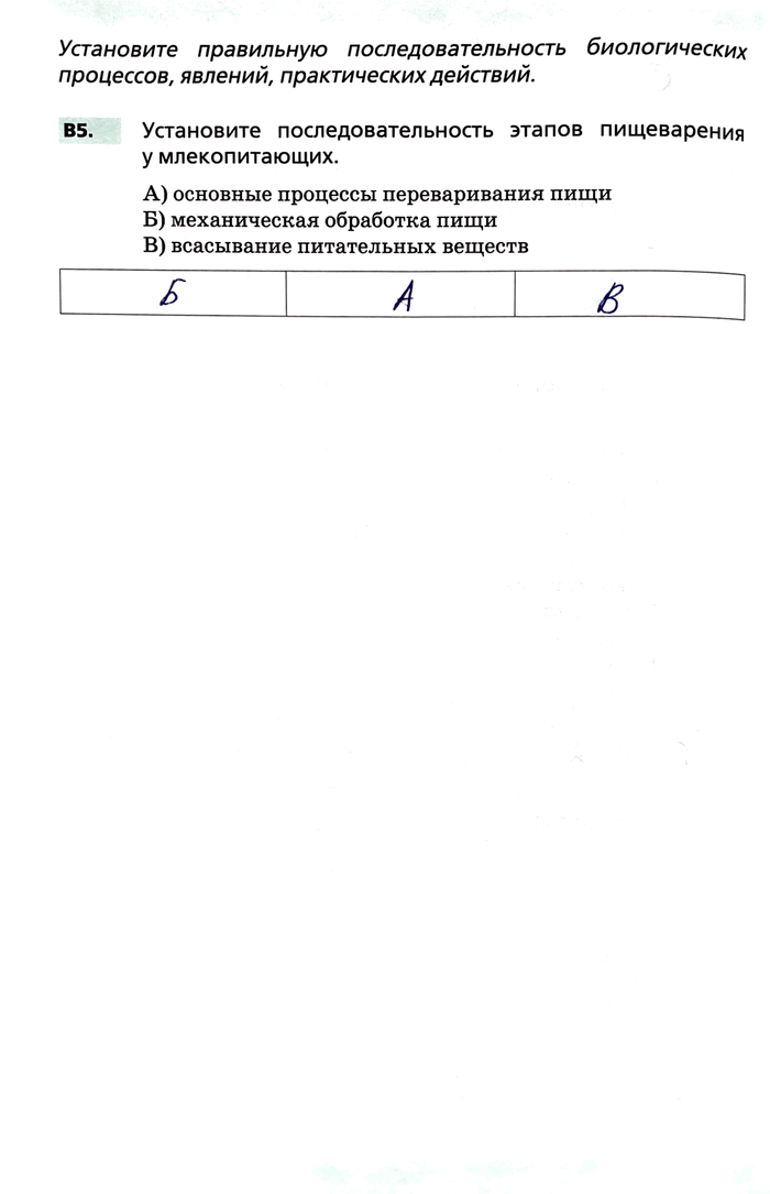 Установите правильную последовательность биологических процессов, явлений, практических действий. В5. Установите последовательность этапов пищеварения у млекопитающих. A) основные процессы переваривания пищи