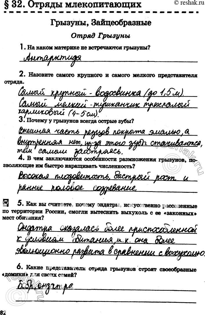 §32. Отряды млекопитающих Грызуны, Зайцеобразные Отряд Грызуны 1. На каком материке не встречаются грызуны? 2. Назовите самого крупного и самого мелкого представителя отряда.