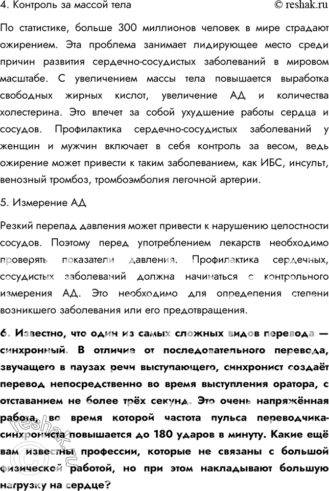 6. Известно, что один из самых сложных видов перевода — синхронный. В отличие от последовательного перевода, звучащего в паузах речи выступающего, синхронист создаёт перевод непосредственно во время выступления оратора, с отставанием не более трёх секунд. Это очень напряжённая работа, во время которой частота пульса переводчика-синхрониста повышается до 180 ударов в минуту. Какие ещё вам известны профессии, которые не связаны с большой физической работой, но при этом накладывают большую нагрузку на сердце?